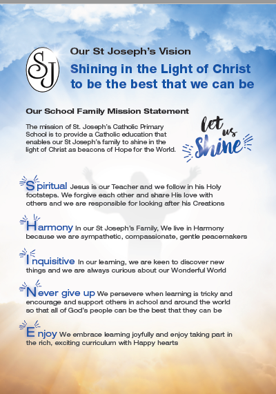 At St. Joseph's Catholic Primary School we welcome and value everybody in our St Joseph's school family. We strive for our school to be a place where children feel a strong sense of belonging. As a Catholic School, we seek to live out the values of Jesus Christ. We promote these values through our words and deeds, recognising that every child is unique and created in the image of God.